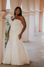 A-line dresses are great for the plus size bride if you want more coverage. The silhouette flares out after the bust. Instead of hugging your curves, the dress flows and is a bit more classic.